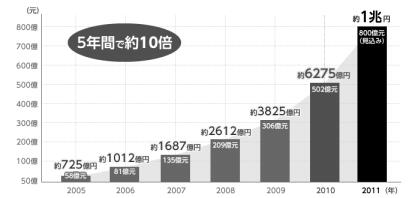 三一グループの売上高はこの5年間、うなぎ登りである。2005年に58億元(約725億円)だった売り上げは、06年81億元(約1012億円)になったのを皮切りに勢いを増し、07年135億元(約1687億円)、08年209億元(約2612億円)、09年306億元(3825億円)、そして10年には502億元(6275億円)に達した。その勢いは止まらず、2011年に800億元(約1兆円)を見込んでいる。 PR |