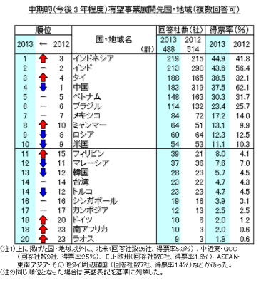 政府系金融機関の国際協力銀行 http://www.jbic.go.jp/ja が毎年、行っているアンケート調査で日本の製造業が有望な進出先と考える国として21年連続でトップだった中国が4位に転落し、1位はインドネシアで去年の3位から初めてトップとなりました。2位は去年と同じインド、3位は去年4位だったタイと,中国に代わって東南アジアの国が順位を上げました。