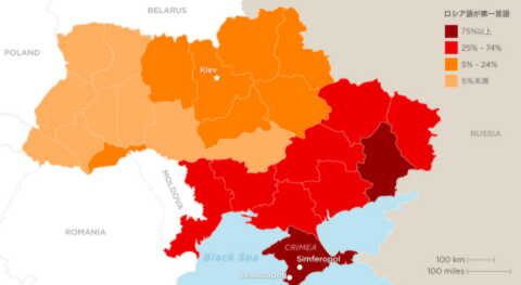 ウクライナ政変1年 国家分断,経済破綻 疲弊する国民ウクライナで親欧米派市民が街頭デモによりロシア寄りのヤヌコビッチ前政権を倒して2月23日で1年となる。親欧米政権を確立したものの,反発したロシアに南部クリミア半島を編入され,東部は親ロシア派武装組織が蜂起し独立を主張,国家は分断状態に陥った。終わりの見えない紛争に,破綻状態に陥った経済と危機は深まる。 戦費の増大で,以前から不安定だった国家財政はデフォルト(債務不履行)の瀬戸際に陥った。国際通貨基金(IMF)の金融支援など国際社会の助けを借りて立て直しを図るが,世界最悪レベルの汚職体質や非効率な政府・民間の体制改革は紛争の陰に隠れてあまり進んでいない。 街中の両替所で1年前は1ドル=8フリブナ程度だった為替レートが現在は1ドル=28フリブナを超える。急激な通貨安に伴い政府は今年のインフレ率を26%と予想しており,国民生活はさらに逼迫(ひっぱく)しそうだ。 ≪外相が来月訪日 紛争解決・ロシア対応協議≫ウクライナのクリムキン外相が3月1~3日に来日し,岸田文雄外相と会談する予定である。ウクライナ閣僚の来日は,昨年2月の政変などに始まるウクライナ危機後初めてで,先進7カ国(G7)の一角である日本との連携強化が狙い。プーチン大統領の訪日をめぐり調整を続けるロシアは,外相会談を注視する構えである。 ウクライナ東部では,親露派武装組織が独立を主張して政府軍と交戦,今月15日の停戦発効後も一部で戦闘が続く。外相会談では紛争解決のための協力や,ロシアへの対応などについて協議する見込み。危機的状況に陥った経済の立て直し支援も話し合われる見通しである。 日本政府は,ロシアによる昨年3月のウクライナ南部クリミア半島編入を「力による現状変更」と批判,クリミア返還を求めるウクライナ政府を支持している。安倍首相が昨年3月,オランダでのG7緊急首脳会議でウクライナへの最大1500億円の援助を表明するなど,日本はG7各国と連携しウクライナを支援。クリムキン外相は日本側に支援継続を求めるとみられる。 出典: 2001 Ukraine Census ◆言語国民の7割は公用語のウクライナ語を話すが,ロシア語も広く使われている。ロシア系住民が多数を占める東部や南部クリミア半島などでは,ロシア語が第一言語というケースが多い。クリミア自治共和国の首都シンフェロポリでは2月27日,ウクライナ新政権の発足に対して激しい抗議デモが起きた。クリミア半島はヤヌコビッチ前大統領の1610 |