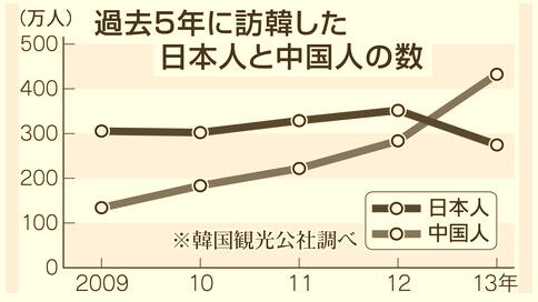 韓国観光公社の統計によると,韓国の外国人入国者数は、1978年に108万人とはじめて100万人を超えた。その後,1988年:234万人、1991年:320万人、1998年:425万人、2000年:532万人、2005年:602万人、2009年:782万人、2010年:880万人、2011年:979万人と増加傾向にある。 2012年には遂に1000万人の大台を超えて1114万人となった。為替レートが1円=14ウォンに達した2012年の国別入国者数は、第1位が日本の352万人(31.6%)、第2位が中国の284万人(25.5%)、第3位が米国の70万人(6.3%)であった。この3カ国の合計は706万人であり、全体の63.4%を占めている。 2013年初めて、国別の訪韓者数で中国が日本を追い抜き、首位に躍り出た。円安や日韓外交の悪化で訪韓日本人が減少する中、中国人観光客はビザの要件緩和もあり増え続けている。 ドラマ「冬のソナタ」に始まる韓流ブームも下火になりつつあり、旅行業大手の担当者は「安さと近さが魅力の韓国だったが、今後は『どうしても行きたい』との付加価値をつけていかねばならない」としてる。 1241 PR |